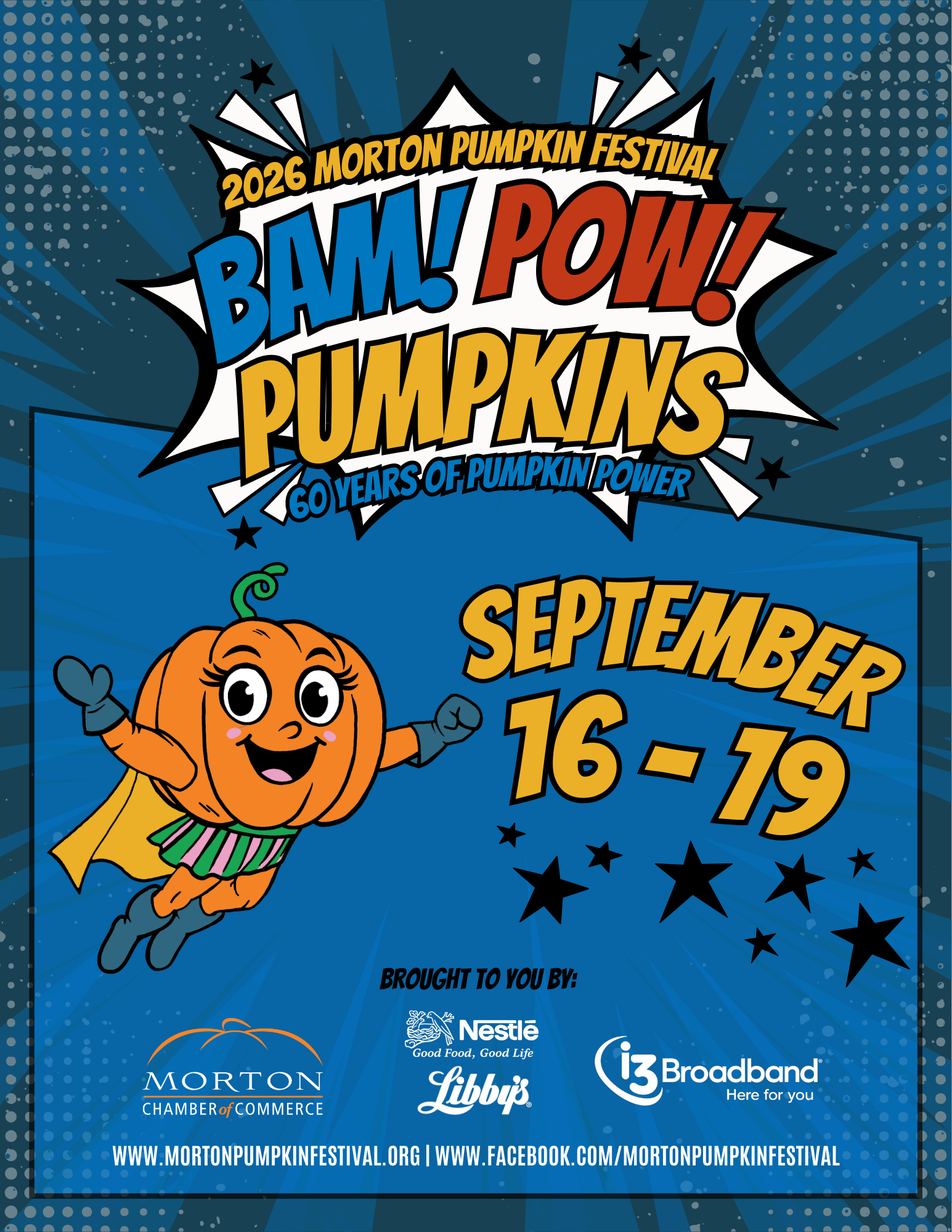 We welcome you to the 60th Annual Morton Pumpkin Festival, September 16th - 19th, 2026. We hope you and your family can join us to gather & give back to our community. This yearβs theme is βBam Pow Pumpkins!β - 60 years of Pumpkin Power!
